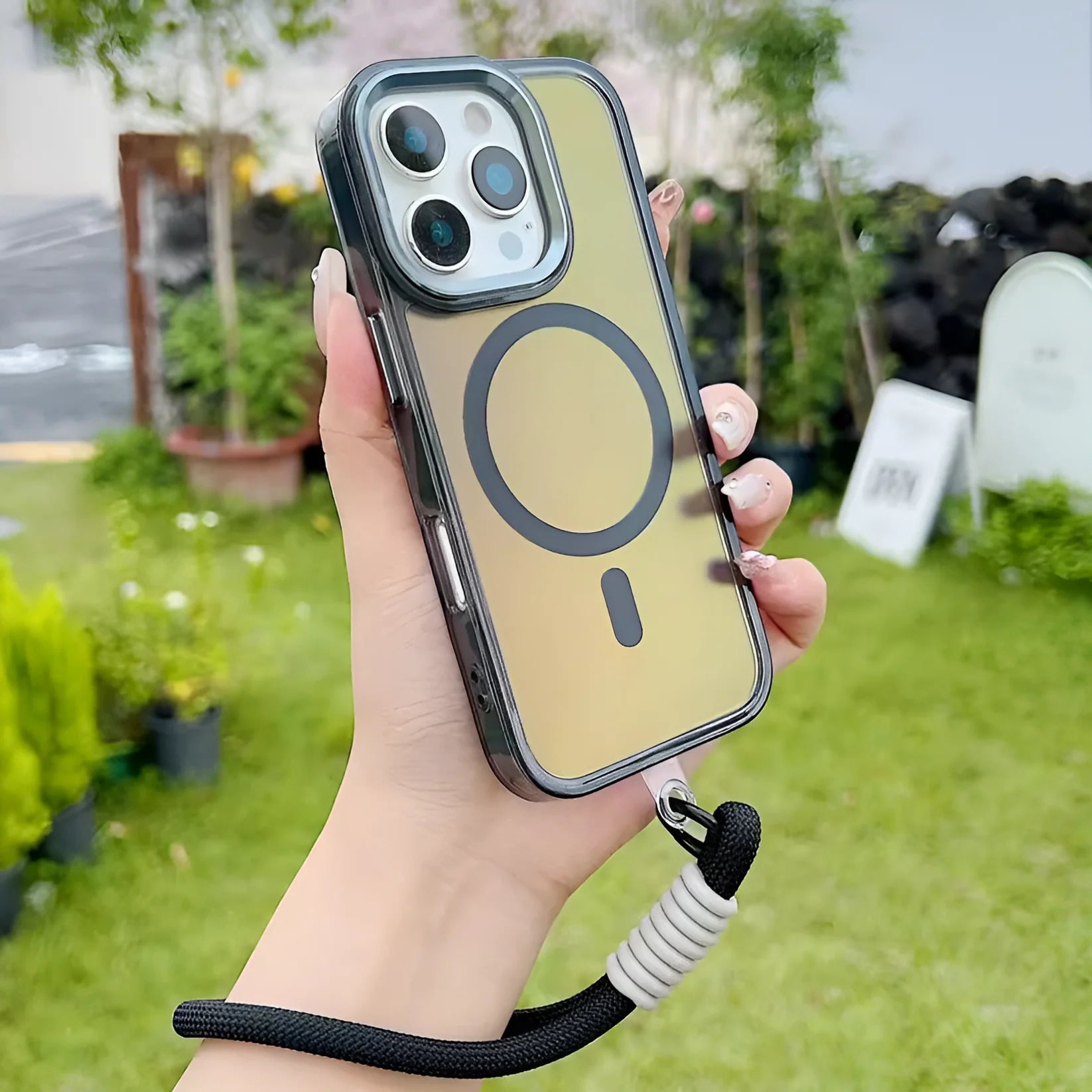 This phone cover is a stylish, protective, and smart choice for iPhone users who love both fashion and functionality. Its transparent body with a bold turquoise MagSafe ring gives it a modern appeal, while the case is specially designed to change color under different lighting and angles, adding a unique touch. Built with high-quality materials, it offers strong protection against scratches, drops, and bumps. The raised camera and screen edges ensure added safety for delicate parts of your phone. With a matching turquoise hand strap, it not only looks chic but also provides convenience and a secure grip. This case truly blends innovation, elegance, and durability in one.